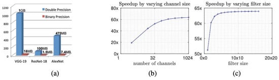 This figure shows the efficiency of binary convolutions in terms of memory (a) and computation (b,c). (a) contrasts the required memory for binary and double precision weights in three different architectures(AlexNet, ResNet-18, and VGG-19). (b,c) show the speed improvement achieved by binary convolution under (b) different number of channels and (c) different filter size. Taken from [].