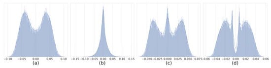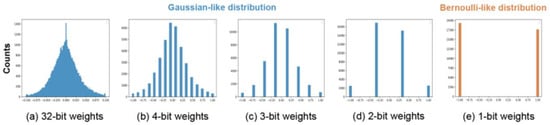 In the BD-BNN optimization process, we use known gradient approximation [,]. The weight distribution of BD-BNN shifts at each stage of the training, so the final weight distribution is optimal for the binarization process, as seen in Figure 8. We found that, on average, around 50% of the weights changed their sign in BD-BNN as compared to binarization of a pre-trained network.