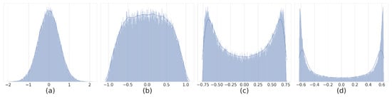 Notwithstanding the immense interest in BNNs, the challenge remains to close the accuracy gap between the full-precision (FP) and binarized versions. The importance of maintaining the appropriate data distribution is a key issue in many works, specifically in DNN compression studies; while [] uses a normally distributed prior for the weights and activations, ref. [] uses a log-normal distribution prior for the neural gradients. In both cases, they show that the choice of distribution approximation has a significant impact on the final model’s accuracy. KURE [] represents a step forward, by offering matching between the data distribution and the task. The authors show that uniform distribution is more robust under quantization noise and suggest a technique that allows for the uniformization the distribution of the weights.