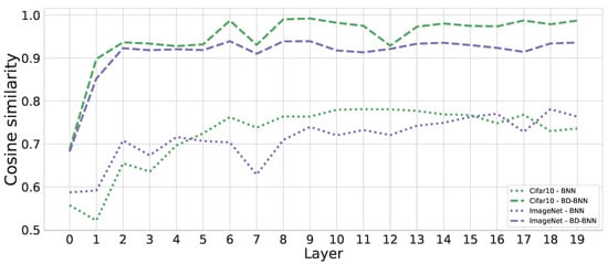 Cosine similarity per layer of ResNet18, trained on CIFAR10 and ImageNet datasets, dotted lines for simple trained networks, dashed for BD-BNN.