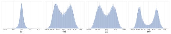 Distribution shifts throughout BD-BNN training. The displayed weights are of the first convolution layer on the second block of ResNet-18 trained on CIFAR-10. (a) is the teacher network, (b) regular BNN, (c) BNN with our weight regularization and (d) WDM applied with teacher–student scheme.