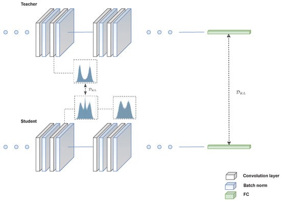 where refers to Kullback–Leibler divergence, and and are the output of the last fully connected layer in the teacher and student network, respectively.