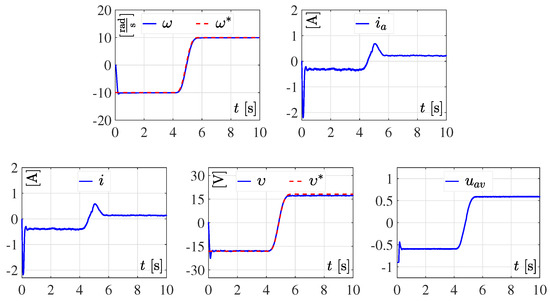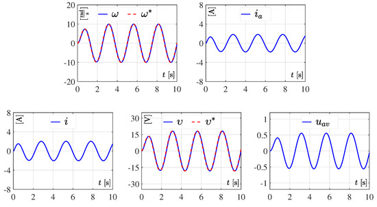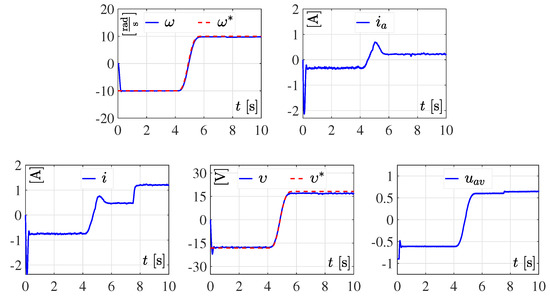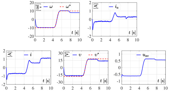 Here, we proposed and for times and , respectively. Figure 5 shows the experimental evaluation performed by the full-bridge Buck inverter–DC motor system in closed-loop.