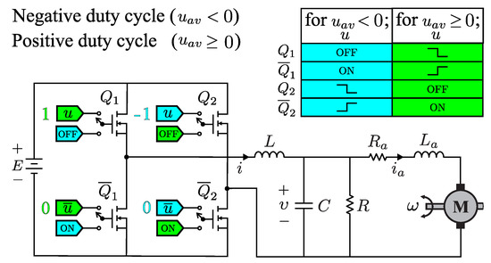 As stated in [40], the switched model of the full-bridge Buck inverter–DC motor system shown in Figure 2 is given by