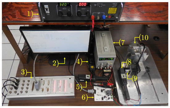 A photograph showing the connections of the built full-bridge Buck inverter–DC motor system in closed-loop is exhibited in Figure 3. The elements associated with this photograph are the following: (1) energy power source E, (2) desktop computer, (3) dSPACE DS1104 R&D controller board, (4) voltage differential probe to obtain (via a Tektronix P5200A probe), (5) current probe to find i (via a Tektronix A622 probe), (6) full-bridge Buck inverter, (7) energy power source for the instrumentation of the electronics stage, (8) current probe to acquire (via a Tektronix A622 probe), (9) Omron E6B2-CWZ6C encoder to determine , and (10) Engel GNM 5440E-G3.1 DC motor.