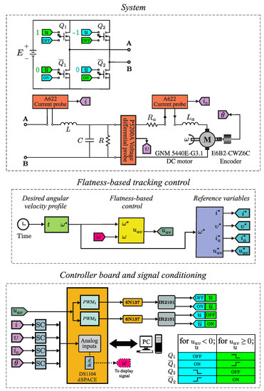 - Hernández-Márquez, E.; Avila-Rea, C.A.; García-Sánchez, J.R.; Silva-Ortigoza, R.; Marciano-Melchor, M.; Marcelino-Aranda, M.; Roldán-Caballero, A.; Márquez-Sánchez, C. New “full-bridge Buck inverter—DC motor” system: Steady-state and dynamic analysis and experimental validation. Electronics 2019, 8, 1216. [Google Scholar] [CrossRef]