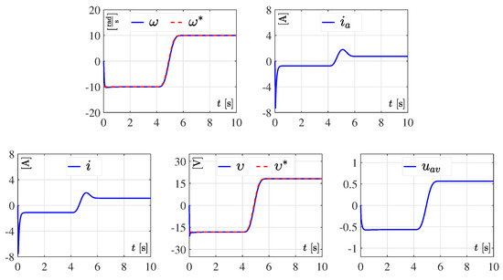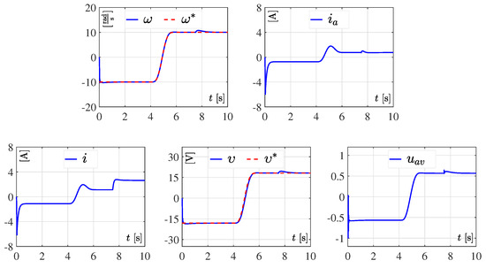 In the context of the bidirectional “DC/DC Buck converter–DC motor” systems, one of these bidirectional proposals is the “full-bridge Buck inverter–DC motor” system. This system, recently reported in [40], was controlled by designing a passive tracking control based on the ETEDPOF method in [41]. With such an approach, the control objective is achieved, i.e., the angular velocity converges to a desired angular velocity profile . However, when abrupt variations in load R are introduced into the system in closed-loop, no longer tracks . This can be seen in Figure 1, which corresponds to the experimental results reported in [41] associated with abrupt changes in load R.
