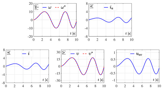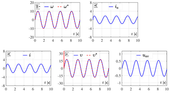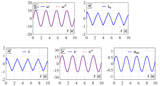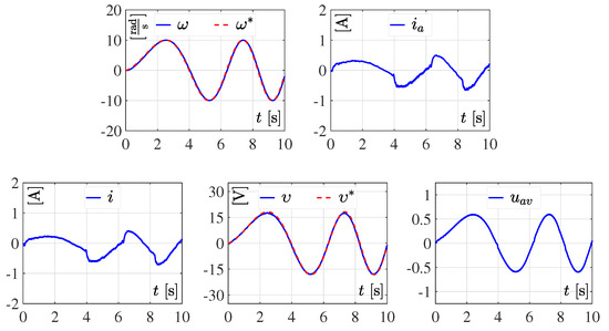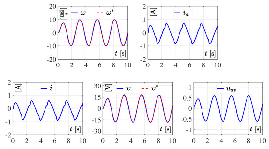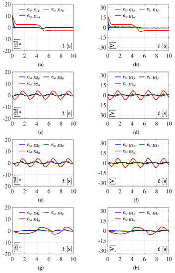 - The experimental dynamic responses of the system in closed-loop with the passive control based on the ETEDPOF strategy, developed in [41]. Here, the closed-loop tracking errors of the angular velocity and voltage denoted by and , respectively, were declared aswhere subscript , for , represents the experimental response from which the tracking error was obtained.
