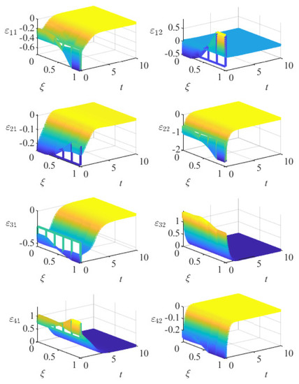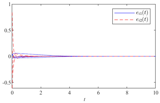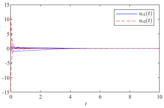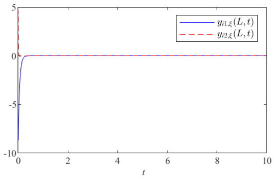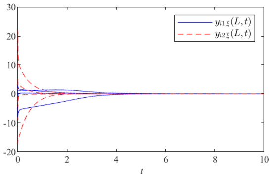 According to Theorem 1, solving LMI (20) by Matlab, the control gains , is obtained. It can be shown in Figure 1 and Figure 2 that the MAS (1)–(4) achieve consensus, the states of the MAS eventually converge, and the error between agents tends to 0, which means that the agents agree on speed or reach a certain point in time in engineering field. The boundary coupling (3) and (4) with the feedback gain are shown in Figure 3 and Figure 4.