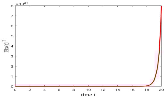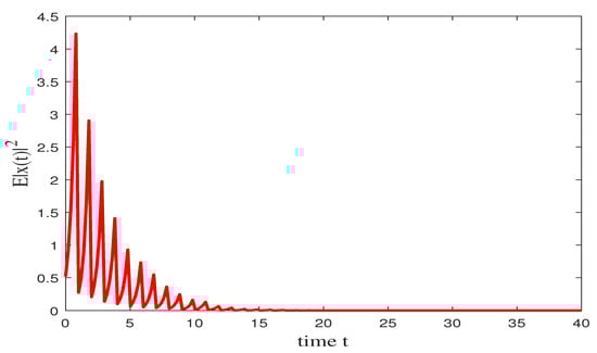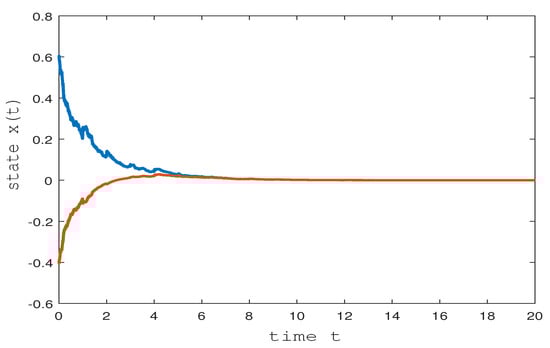 According to Corollary 1, the trivial solution of (46) is exponentially stable in mean square. Of course, the trivial solution of (46) is also almost surely exponentially stable, the simulation is presented in Figure 3 in which the initial value is .