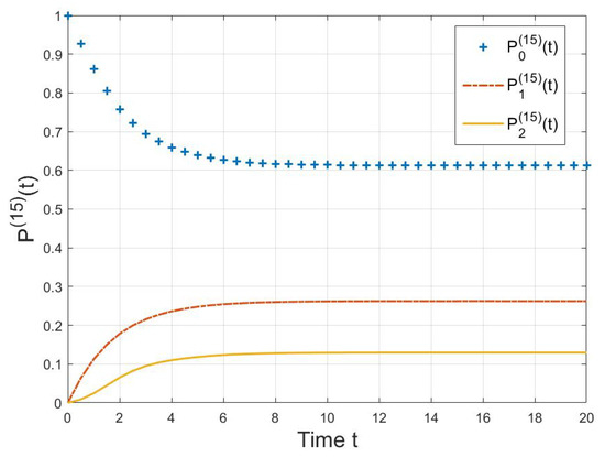 By solving the Equation (26), we can derive the approximating solution of system (25) directly. Figure 1 shows dynamical behaviour of the approximation solution , and , which corresponding to the probability distributions of the software system in with , where