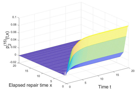 Figure 1 indicates that the probability of the system in each state will gradually tend to stable as time increases, which corresponds to the fact that the solution of system (21) and (22) gradually tends to a steady-state solution as t tends to infinity. On the other hand, Figure 2 plots the dynamical behaviour of with . Figure 2 shows that for any fixed t, as x grows. This situation agrees with for any given time t and also conforms to reality. As a result, Figure 1 and Figure 2 show that, by using a few nodes, the approximation solution for the software rejuvenation system (21) and (22) on bounded t-intervals can be derived.