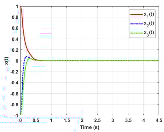 On the other hand, it is easy to see that the results derived by our method are much better than [10,11,12,13,14] when the delayed piecewise are 3. This could be due to the delay partitioning method having established more interconnected information with the delayed state vectors. Compared to the results in [21], the results are little better when and . However, the analytical bounds are also listed in the table for this example. One can see that as and , the maximum upper bounds obtained in this paper achieved analytical bounds as . So, from this point of view, the results obtained by our method are more effective.