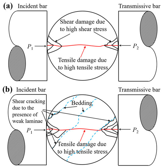 - The presence of weak planes, microcracks and laminae cause the shear damage zone to behave in a more complex manner. If the crack plane coincides with the high shear stress plane, the developed shear cracks extend along the weak laminae and the shear damage zones in BD specimens are not symmetrically distributed.