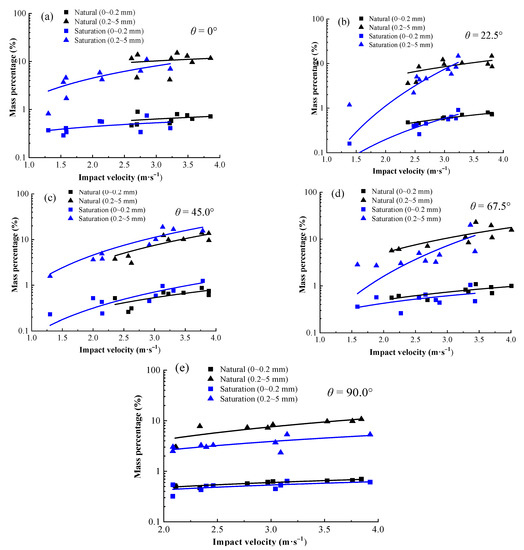 - When the laminated surface of the coal sample is at a certain angle with the impact loading direction, the damage mode is coupled with tensile and shear damage. For the natural or saturated coal samples with debris particle sizes of 0~0.2 mm, the percentage of debris mass does not change much with the increase of impact velocity. In addition, the percentage of fragment mass increases significantly with the increase of impact velocity for the natural or water-saturated coal samples with the fragment size of 0.2~5 mm.