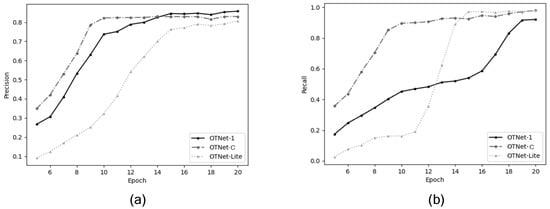 As shown, all three versions of the OTNet only require relatively few epochs to achieve satisfying results with the highest precision rate reaching 85.73% and the highest recall rate reaching 97.95%. This indicates that the model is able to massively save the time cost of training.
