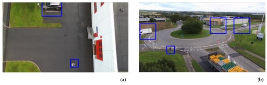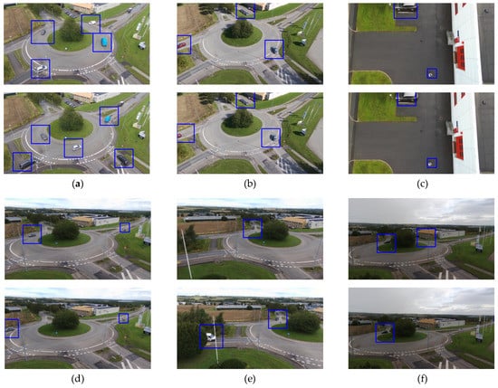 The dataset we chose contains 8 video clips, such as crossroads, parking lots and a small number of highway scenes, from multiple orientations, heights and angles. For each scene, we randomly selected 50–100 consecutive frames as the test set and the rest as the training set. In these images, we faced challenges, such as extremely small objects, occlusions, and viewpoint transitions, due to the different flight heights and angles. Moreover, the videos cover various lighting conditions due to the time of the day and the weather conditions (e.g., sunny, partly sunny, and cloudy) [