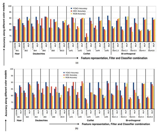 The results of applying DWT transform in Pap smear classification using feature representation scheme (a) F1 and (b) F2. The X-axis shows different classifiers and filter combinations. Y axis denotes the accuracy of the method under color models YCbCr, HSV, and RGB. Both results are obtained on the generated database.