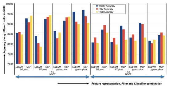 Results were obtained after applying RT under F1 and F2 schemes on the generated database. The X-axis denotes different classifiers and filter combinations, and Y-axis denotes the accuracy of the method under color models YCbCr, HSV, and RGB.