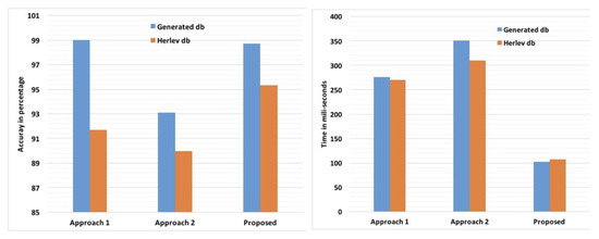 We have compared the finally selected NSCT based approach with two existing approaches previously developed by us. In Approach 1 [1] shape, texture and color features of the images were considered for classification purpose. Shape features were extracted using proposed segmentation technique. Ripplet Type 1 transform was used for color and texture feature extraction. Some other texture features were extracted using Histogram analysis and GLCM method. Finally classification was performed using ensemble classification using weighted majority voting as a measure. In Approach 2 [13] deep learning features were considered for classification. Here deep features were extracted using CNN which was followed by feature selection using an unsupervised feature selection technique and classification using LSSVM and softmax regression. The comparison statistics are showed graphically in the Figure 5. From Figure 5 it is observed that between the first two approaches, Approach 1 is far better both in terms of accuracy and time. Further, the performance of the newly proposed model is more satisfactory than Approach 1 due to two main reasons: (a) The accuracy of the newly proposed method (98.00–99.50%) is almost equal to the accuracy of Approach 1 (98.00–99.01%), whereas (b) The computational time of the new method is less than half that of Approach 1.