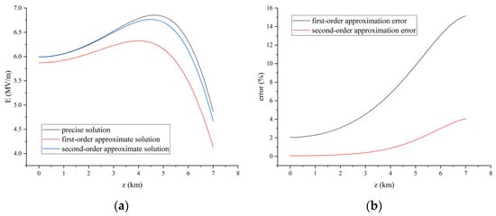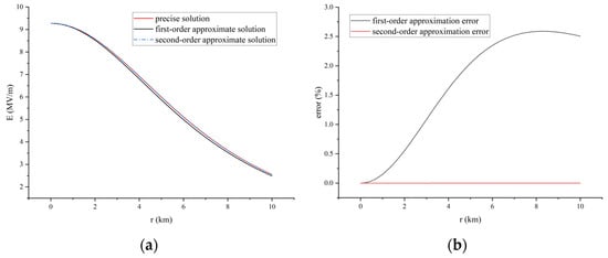 Let the body charge density of the cylindrical charge stack of a thunderstorm cloud be 1 nC/m3, the radius of the cylinder be 2 km, and the heights of the upper and lower boundaries of the cylinder from the ground be 10 km and 7 km [17]. The exact solution, the first-order approximate solution and the second-order approximate solution are used respectively to calculate the electric field generated by a thunderstorm cloud within the radius of 10 km and the height of 7 km, and the results are shown in Figure 1. It can be found that the error between the second-order approximate solution and exact solution is smaller than the error between the first-order approximate solution and exact solution in the three-dimensional stereogram of Figure 1. The comparison and relative error of the first-order approximate solution, second-order approximate solution and exact solution for r = 0, r = 5 km, h = 0, h = 5 km are shown in Figure 2, Figure 3, Figure 4 and Figure 5 respectively. It can be seen from the figure that when z = 0 and r = 0–10 km, the maximum error between the first-order approximate solution and the exact solution is about 2.6%, while the error between the second-order approximate solution and the exact solution is always about 0. When z = 5 km and r = 0–10 km, the maximum error between the first-order approximate solution and the exact solution is about 13.2%, while the maximum error between the second-order approximate solution and the exact solution is about 3.1%. When r = 0, the first-order approximate solution and the second-order approximate solution are transformed into the exact solution, so the three lines of electric field coincide completely. When r = 5 km and z = 0–7 km, the error between the first-order approximate solution and the exact solution increases from 0 to 15.1%, while the error between the second-order approximate solution and the exact solution increases from 0 to 4.1% with the increase of height. By comparison, it is found that the error between the second-order approximate solution and the exact solution is significantly smaller than that between the first-order approximate solution and the exact solution.
