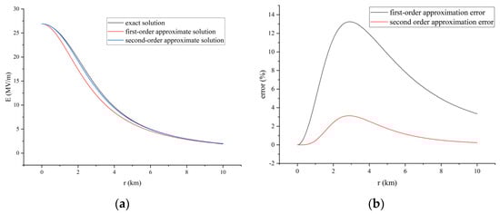 (a) Comparison of the first-order approximate solution, second-order approximate solution and exact solution while r = 5 km. (b) Relative error of first-order approximation and second-order approximation while r = 5 km.