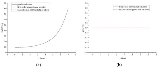 (a) Comparison of the first-order approximate solution, second-order approximate solution and exact solution while z = 5 km. (b) Relative error of first-order approximation and second-order approximation while z = 5 km.