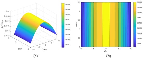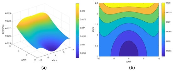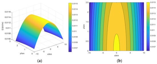 A large number of electric field soundings and charged particle soundings [18,19,20,21] within a thunderstorm cloud confirm that a thunderstorm cloud has a simplified tripolar charge structure [22,23,24] (a positive charge region in the upper part, a negative charge region in the middle part, and a small positive charge region in the lower part). A typical three-level charge structure thunderstorm cloud is selected as the excitation source, and its charge structure and parameters are shown in Figure 6. The electric field distribution and electric field contours of a thunderstorm cloud in the longitudinal section of y = 0, 16 km, 22 km, 30 km and 40 km are shown in Figure 7, Figure 8, Figure 9, Figure 10 and Figure 11. It can be seen from the figure that the spatial electric field is axially symmetrically distributed at different distances due to the centrosymmetric distribution of the tripole charge pile of the thunderstorm cloud.