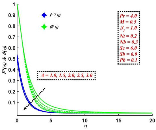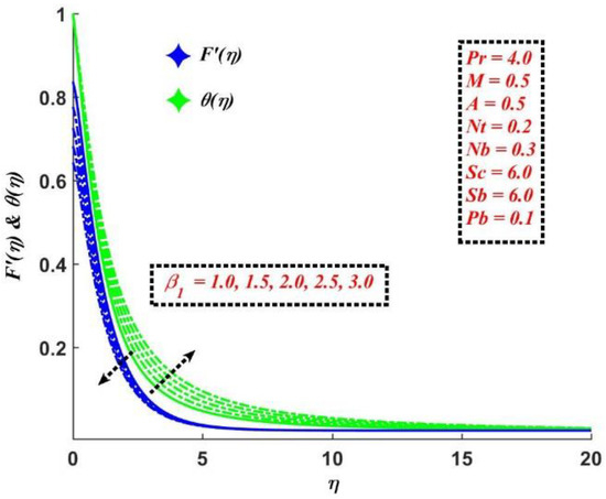 The effect of the magnetic parameter on the dimensionless velocity, temperature, concentration, and concentration of motile micro-organisms’ fields are shown in Figure 4 and Figure 5. The magnetic parameter is the proportion of electromagnetic force to inertial force; thus, when increases, the velocity field decreases. Due to the presence of a magnetic field, the Lorentz forces are considered to be in hydro-magnetic flow. As increases, the strength of the induced magnetic forces increases, with a drop in the velocity field. In addition, the temperature field increases with increasing at any point on the BL. This is because when a magnetic field is applied to a flow area, it produces a Lorentz force, which acts as a retarding force, causing the temperature of the fluid inside the BL to rise, as seen in Figure 4. Furthermore, the sheet’s surface temperature may be controlled by varying the strength of the applied magnetic field, which also helps in improving the and , as can be seen in Figure 5.