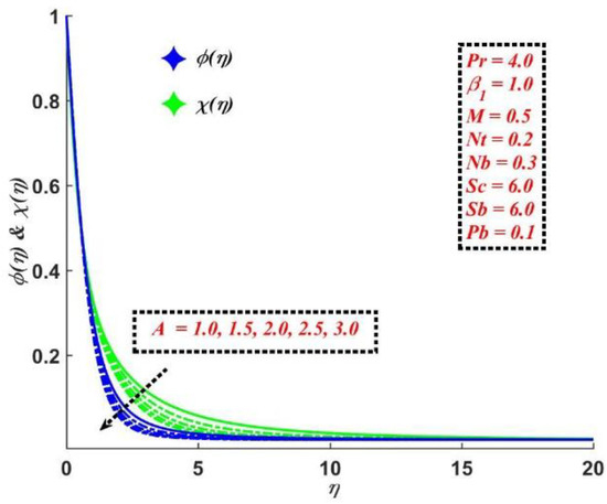Figure 8 shows how different values of the Prandtl number, Pr, affect the temperature and concentration distribution. As can be seen in Figure 8, increasing the lowers the temperature and concentration. is calculated by the amount of momentum to thermal diffusion. As the rises, thermal and mass diffusion decreases, resulting in a smaller TBL and CBL, as it turned out to reduce and .