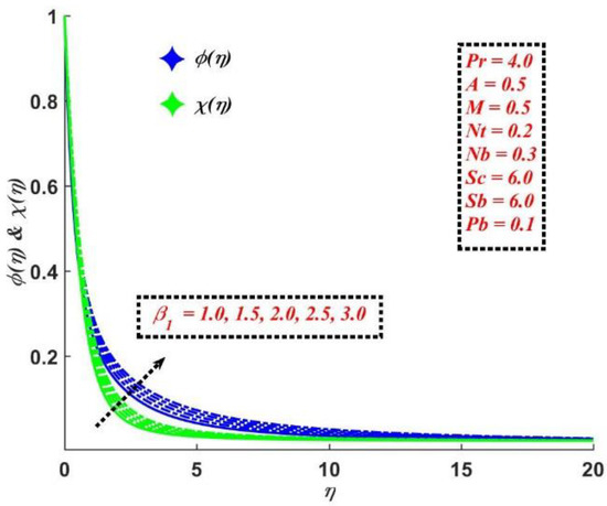 Figure 6 shows the velocity and temperature fields for varying values of . The velocity decreases as the slip parameter increases, while the temperature increases. This is because when the slip condition occurs, the stretching sheet’s velocity differs from the flow near the sheet’s velocity. The fluid does not receive a majority of the stretching velocity. As a result, the velocity profile is reduced. In contrast, when is increased, subsequently, the rate of heat transmission from the surface to the ambient fluid is significantly reduced. Thus, the temperature field improves. The same effects are observed for concentration and concentration motile micro-organisms’ profiles in Figure 7. Increases in the slip parameter induce surface friction, which generates a frictional force that causes the particles moving through the fluid to slow down. As a result, the distributions of the nanofluid concentration and the concentration of motile micro-organisms are amplified.
