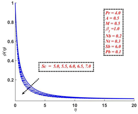 The Schmidt number has a considerable influence on the mass distribution as it increases. Such influence on and is depicted in Figure 11 and Figure 12. The Schmidt number describes the mass momentum transition. It is a physical number that is calculated as the proportion of kinematic viscosity to mass diffusivity in the flow regime, where mass and momentum diffusion circulation mechanisms occur simultaneously. From Figure 11 and Figure 12, it is clear that increasing the Schmidt and bio-convection Schmidt numbers reduces the mass and the micro-organism diffusion and, as a result, and are decreased.
