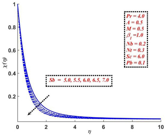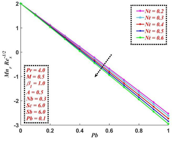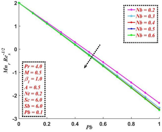 Figure 13 demonstrates the effect of on . The increment in Pb enhances . By using values greater than one and less than one, the estimated Peclet number establishes whether diffusion or convection is the dominant mode of mass movement. Diffusion is a process in which molecules move down a concentration gradient in a net flux. Despite convection being far faster than diffusion, diffusion is the most efficient mode of transport for very small volumes, such as in microfluidic systems. It is noticeable that the diffusion propagation transport is more dominant compared with the advection propagation rate. Hence, by increasing the values of the Peclet number, the motile micro-organisms’ profile increases.