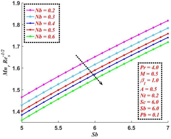 Figure 14, Figure 15, Figure 16 and Figure 17 are discussed to show the variations in the micro-organisms’ number, with , and . In Figure 14, is varied between the range along the thermophoresis parameter in the range . The variations clearly show that decreases for and increases for Sb. Similar effects are observed in Figure 15; by fixing the values of , is changed between . This is because the thermophoretic diffusion and Brownian motion diminish the concentration of the motile micro-organism gradient of the flowing fluid, as the mobility of the micro-organism increases. The fluctuations in the microorganisms’ number with , along with and , are described in Figure 16 and Figure 17. We follow the same range of values for and , whereas is changed between . As shown by the fluctuations, decreases with , and . For the values diffusion is more dominant than convection. Hence, we see the micro-organisms’ number as a decreasing function.