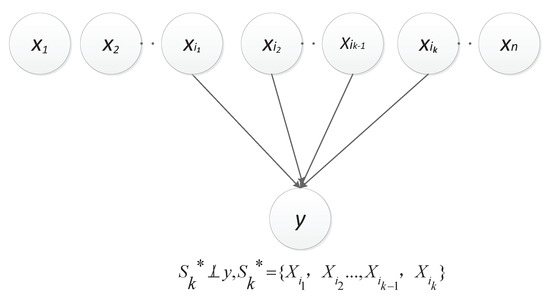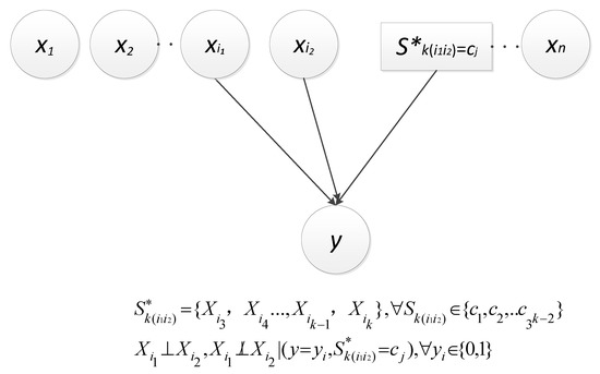 Thus, this paper herein let be the constant 0, i.e., y , which approximately introduces two kinds of dependencies as described in Figure 1 and Figure 2, respectively [25]. Obviously, the dependence between and y is direct (denoted as ); and the other is derived from the v-structure, i.e., and are dependent given a value of y and (denoted as ). Let , represent . In particular, the set is empty when k is equal to 2.