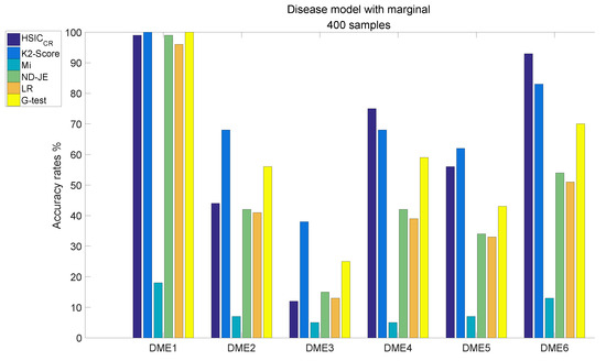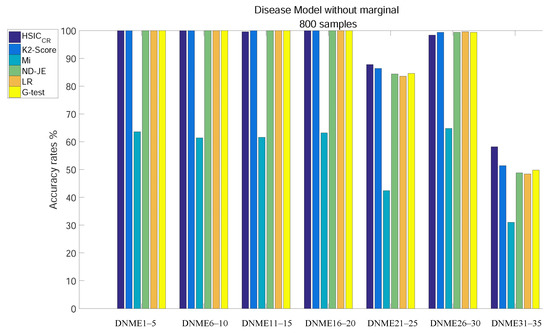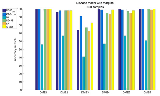 Table 2 reveals the total average accuracy. From Table 2, we can find that Mi has a poor average accuracy; the K2-Score has the best average accuracy rate regardless of the model’s sample scale of 400 or 800, where the main reason is that its accuracy rate on the DME3 test is much better than the other five scoring criteria; although the average accuracy of HSIC tested on DME3 is not good enough, it ranks second in the overall average accuracy rate.