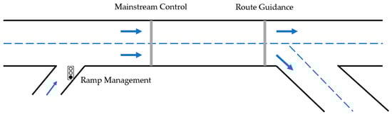 Effective mobility involves a wide range of challenges, including environmental conservation and social and economic development. Since freeways are still the main popular way to move people and goods, they are essential to the expansion of the economy and the maintenance of social harmony. In response, various methods for efficient traffic control in freeway systems have been developed. A common and accepted choice is road-based traffic control. It is accomplished by macrolevel controls on traffic flow, through which the use of a number of regulating mechanisms (Figure 1) can be used to manage the flow of traffic. These mechanisms include ramp management, i.e., ramp metering in conjunction with traffic lights at onramps; mainstream control, e.g., variable speed limits, keep-lane directives, lane control, and congestion warnings; and route guiding, i.e., typically specific signs are posted at crossroads [].