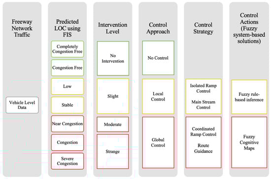 While fuzzy systems approaches have been utilized for a number of traffic-related issues, their potential for controlling traffic to maximize efficiency on highway networks has been underestimated. Effective mobility, on the other hand, is a relatively new topic of study that is receiving a growing degree of interest from the scientific community of traffic control specialists. Next, a Fuzzy Inference System (FIS) and a Fuzzy Cognitive Map (FCM), both of which were conceptualized and built in [,], are used in combination (see Figure 3) for traffic control with the goal of enhancing mobility in large-scale freeway networks. With the suggested fuzzy system-based controllers, a general framework for supervised vehicular traffic is provided in Figure 3. As the application of the proposed framework, vehicle level data can be clustered and computed by FIS in linguistic terms to predict the Level of Congestion (LOC) as the output variable of the system, and then the level of intervention based on the LOC may be assigned. Subsequently, an assumption that can be made here is that fuzzy rule-based inference and FCM may be considered to manage local (e.g., ramp metering, main stream control) and global (coordinated ramp control, route guidance) control actions, respectively.