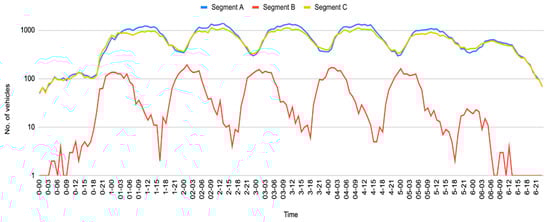 Figure 5 shows the causal linkages and correlations between the segments on a logarithmic scale, where the overall performance of road traffic may be observed over time, indicating how flow in an upstream segment may influence traffic flow in a downstream one. The computed correlation of road traffic flow between segments exposes that A and B correlate (0.03), A and C correlate (0.90), and B and C correlate (0.10). Various inferences and correlation analysis may be done using these values to determine the behavior patterns and intensity of freeway traffic flow.