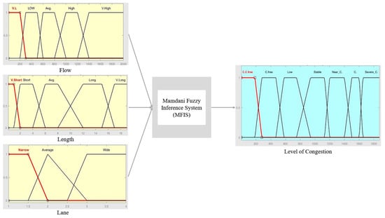 Measuring congestion is essential for optimizing traffic management and control. The creation of an effective transportation system is largely determined by the current road mobility patterns. Therefore, the method applied to evaluate the severity of congestion ought to be sufficiently realistic to enable decision-makers to take the needed steps to alleviate congestion and to rapidly construct an effective transportation system. Consequently, transportation engineers have recognized the exact features that are normally prescribed in a congestion degree [,]. An effective evaluation of congestion should primarily include the following: non-technical companies should be capable of easily comprehending and evaluating the results of the analysis; it should provide a consistent range of possible values; be relevant to all road types; and be capable of predictive and statistical analysis. In addition to these traits, in contrast to conventional approaches to traffic detection, the presented approach has an intelligent discipline recognized as approximate reasoning [,] that sacrifices exact traffic-connected qualities (e.g., geometric features such as junctions, bifurcations, offramps, and onramps) that may be selected in both microscopic and mesoscopic types of traffic modeling in order to achieve substantially lower computational contributions and time.