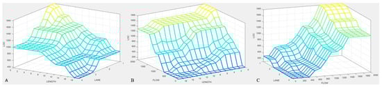 Rule surface of LOC for length and lane (A), and length and flow (B), and flow and lane (C).