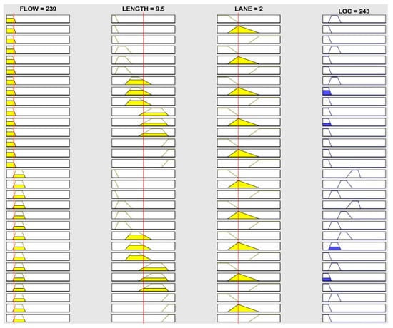 When input data are inserted into the designed FIS, congestion severity can be predicted. If real-time input parameter properties are entered as shown in Figure 9, as an example of the proposed model application: The LOC would be anticipated as 243, which is classified based on the assigned membership function, for the level of congestion-free, given the flow rate of 239, two-lane segment, and its length of 9.5 km.