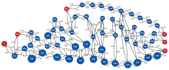 Figure 11 illustrates the FCM with initialized weights and notes. FCM commences performance analysis of the process. In each iteration of the FCM, the state of notes is determined using Equation (7). Higher activation values in the nodes (segments) are reflected by larger nodes in the simulated FCM; these larger nodes signify higher density and display activation values with a stronger influence on the network. Three alternate highways between Budapest and the Austrian border are depicted by S1, S2, and S3 and their 58 segments as nodes in the network. S1 contains nine nodes that end at node ES1 and merges with one of the S2 nodes; S3, as the preferred route, also interacts closely with the nodes in S2, which both end at node E as the last Hungarian segment before entering Austrian territory.