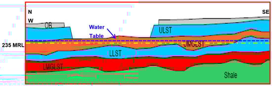 The research was conducted at an Indian limestone mine that serves as a captive limestone mine for a cement mill. The landscape in the case study mine is plain and sloping, with a northeast regional inclination. In the south, the mean elevation is roughly 280 m, whereas, in the north, it is around 240 m above sea level. The mean land slope is 4 m per kilometer. Limestone deposit forms a part of the Chhattisgarh Synclinorium comprising sediments of calcareous, argillaceous, and arenaceous facies represented by the Limestone, shale, and sandstone, respectively. Limestone, magnesian/dolomite limestone, and shale are the principal geological formations found in the area. The beds are mostly horizontal or have a slight incline of 2 to 5 degrees due south. The stratigraphic column of the study limestone mine includes Overburden (OB), Upper Limestone (ULST), Upper MgO Limestone (UMGLST), Lower Limestone (LLST), Lower MgO, and Shale. A typical stratigraphic section of the study limestone mine is presented in Figure 1. The limestone formations run generally northeast-southwest, with modest dips of 2°–3° to the northwest. The deposit has a basic structure, with limestone beds that are practically level and persist at depth.
