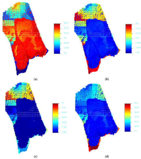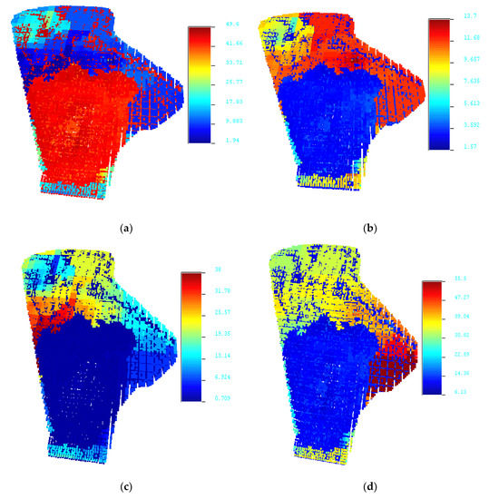 Resource models of CaO, Al2O3, SiO2, and Fe2O3 for the northern block. (a) CaO; (b) Al2O3; (c) Fe2O3; (d) SiO2.
