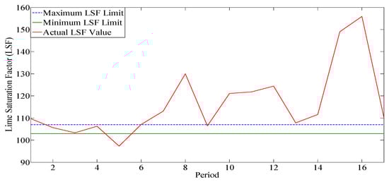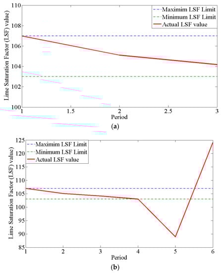 (a) Model 1 LSF value up to three periods with the LSF bound; (b) Lime saturation (LSF) value up to six periods from Model 1 with bound of LSF.