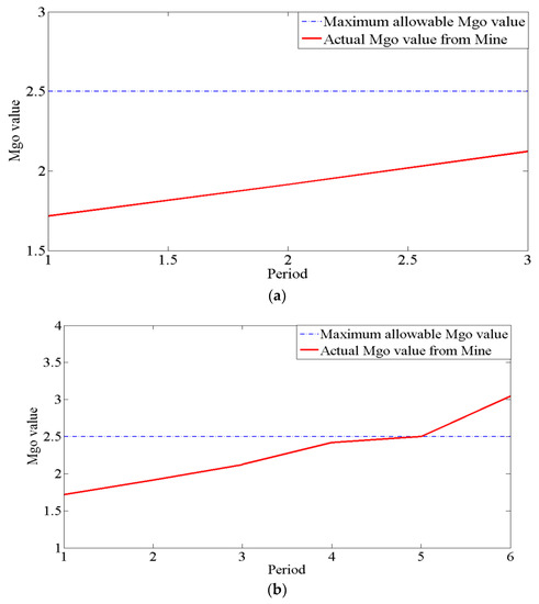 (a) Model 1 MgO value up to three periods with MgO upper bound; (b) MgO value up to 6 periods from Model 1 with upper bound of MgO.