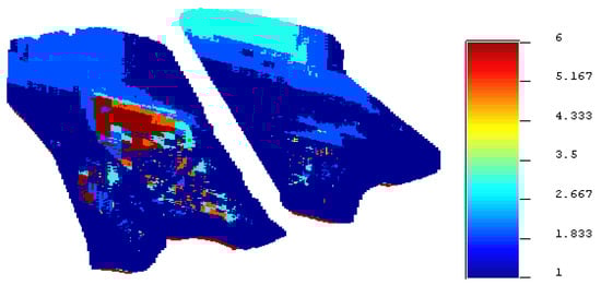 The purpose of this model is to maximize profit while determining the final pit limit and the life of the limestone mine. No additional limestone from other sources was used in this model to meet the cement plant’s requirements. As a result, the model’s results show that the case study limestone mine seems to have the potential to be the cement plant’s single source of the desired quantity and quality of limestone. After applying the branch and cut method to this model, it was determined that it can create feasible solutions up to period 3, indicating that the mine can only serve as the cement plant’s only source of limestone for 15 years. Figure 5 depicts the production of limestone for three years, and shows that limestone output reaches the highest permissible limit, which is 31.55 million tons, which is the study mine’s target production. Figure 6a,b show the average LSF values for these three and six periods. The average LSF values are gradually dropping from period one to period three as shown in the graph. Because profit is a function of LSF, greater LSF values ensure higher profit. Figure 7a,b show the average MgO values for these periods three and six. The average MgO values are growing, as seen in the graph, although they are still within acceptable limits up to the third period. Figure 8 depicts the production schedule. To check whether the ultimate pit can be extended beyond the third period if the constraints are eliminated, model 1 was solved using the blocks left over after period three and relaxing the constraints. The ultimate pit is considered until the objective function value is positive which ensures profit from the deposit. First production limit constraints were eliminated, then LSF constraints, and finally, the MgO constraints. This way the pit can be extended up to the sixth period. The limestone productions, LSF, MgO, and undiscounted cash flow up to six periods are represented in Table 2. It was viewed from the Table that the productions violated marginally the lower bounds in period five; however, there is a substantial deviation in the fourth and sixth periods. It was viewed from the results that the LSF value touches the lower bound in the fourth period; however, after the fourth period, these values are far from the bound (one far below and one far above). It was also observed from the results the MgO value is within the range in the fourth and fifth periods; however, after the sixth periods, the MgO value is higher than the maximum allowable value. The total undiscounted profit from the limestone deposit using this model is INR 1.44 × 1010. The total amount of limestone present within the relaxed solution of the ultimate pit is 357 million tons. This is a crucial observation that when applying the economic parameters as an objective function in production planning, more profit can be generated by extracting less amount of materials. The relaxed model’s ultimate pit is represented in Figure 9.