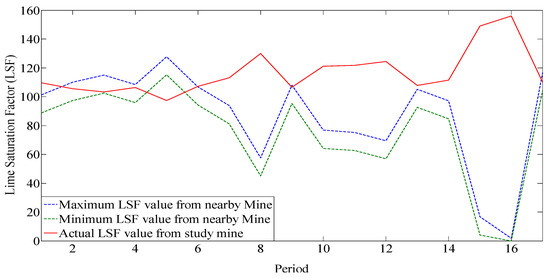 LSF value for Model 2 for 17 periods with LSF bounds for limestone from a nearby mine.