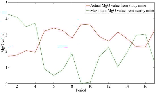 Model 2 MgO values from the study mine and a nearby mine for 17 periods.